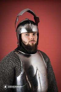 Der Träger sollte einen Kopfumfang von 57-61 cm (ohne Kapuze) haben. Das Helmfutter aus Leder ist kuppelförmig geschnitten, kann angepasst werden und bietet einen angenehmen Tragekomfort, da die Scheitelplatte nicht direkt auf dem Kopf liegt. Außerdem verfügt der Helm über ein Kinnband. Das Innere ist mit Rostschutzfarbe beschichtet. Absolut saubere Verarbeitung. Handgefertigt!